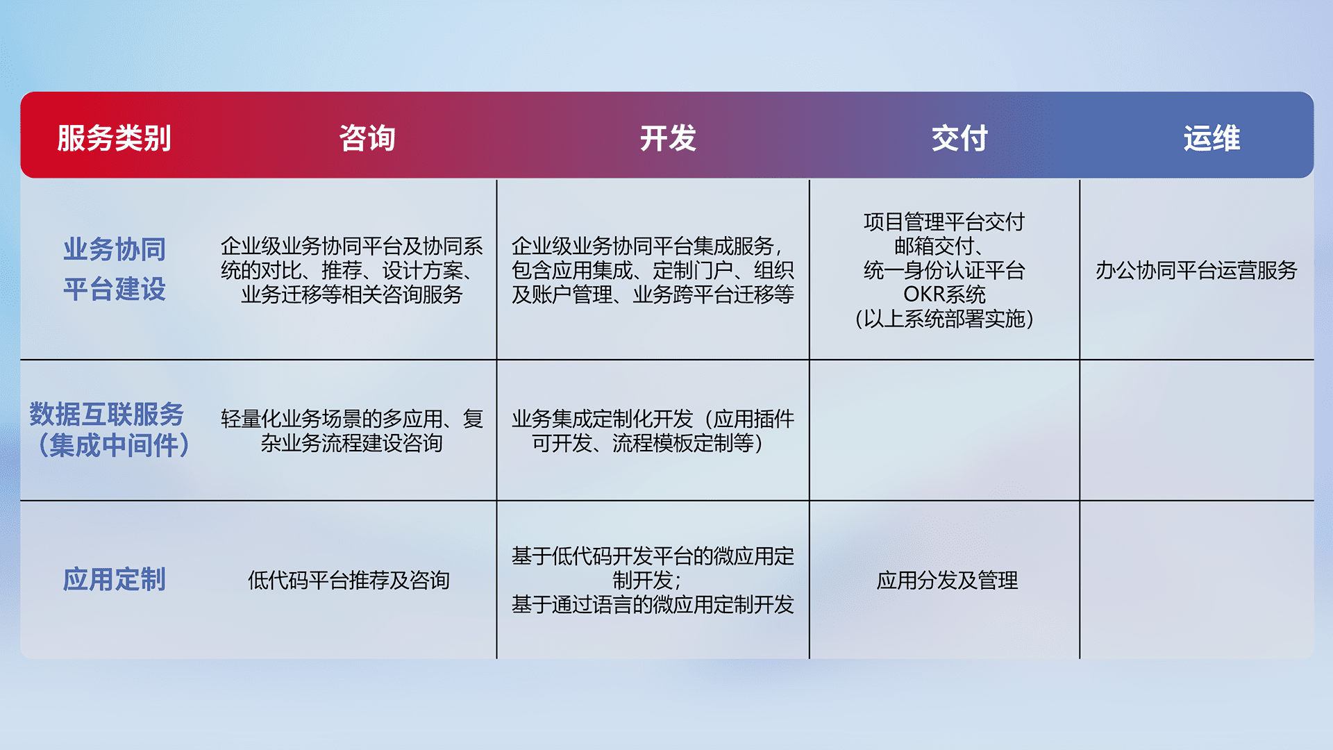 针对钉钉、、、企微、、IDaas等平台级产品提供产品的规划、、、、方案、、交付、、定制化开发等服务,,实现如统一协同办公、、、、智能客户服务、、混合会议管理、、、、智能数据查询、、、等业务场景,,实现数字化转型。。。